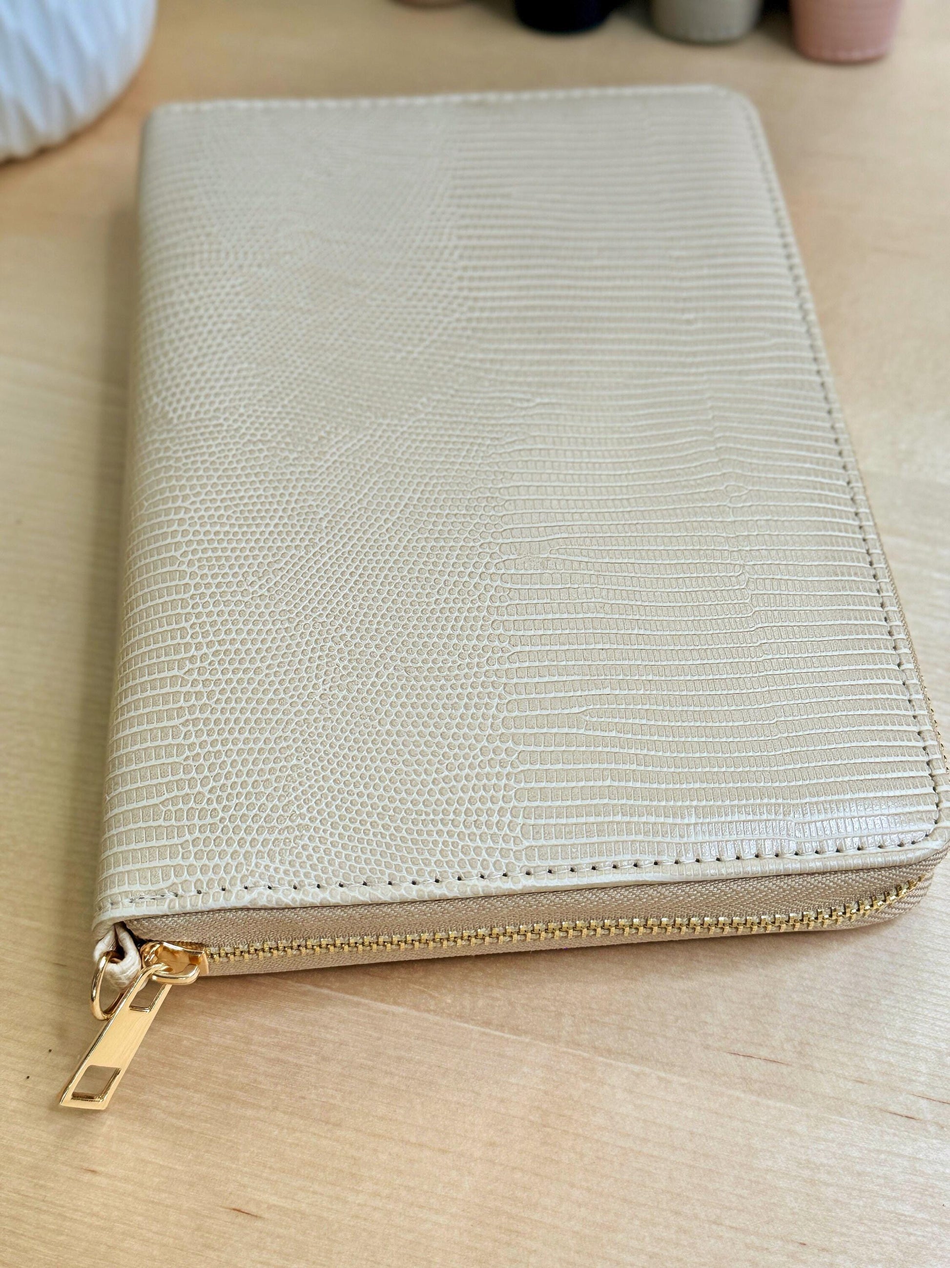 Beautiful *Lizard-print textured* A6 cash stuffing wallet/binders. These are currently being offered with your choice of 6 Colors: NUDE (Light Pink); BLACK, WHITE, LT. STONE (Light Grayish Tan), TAUPE (Darker Tan), and BEIGE (Lighter Tan).