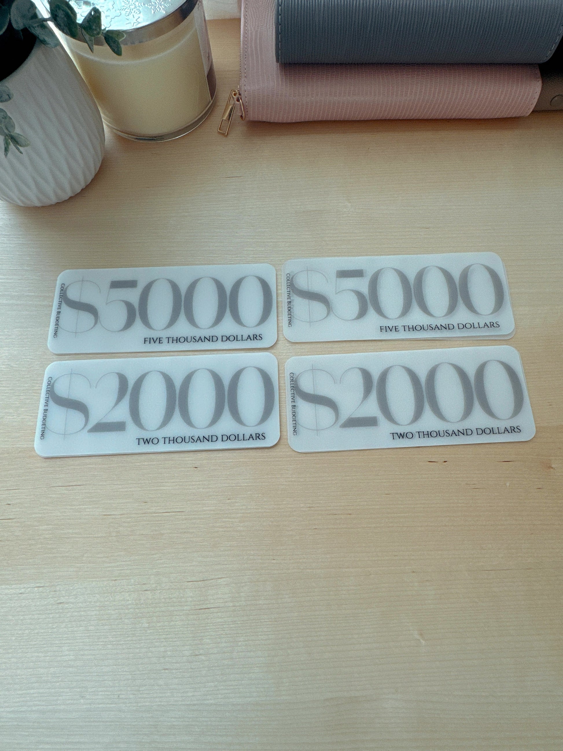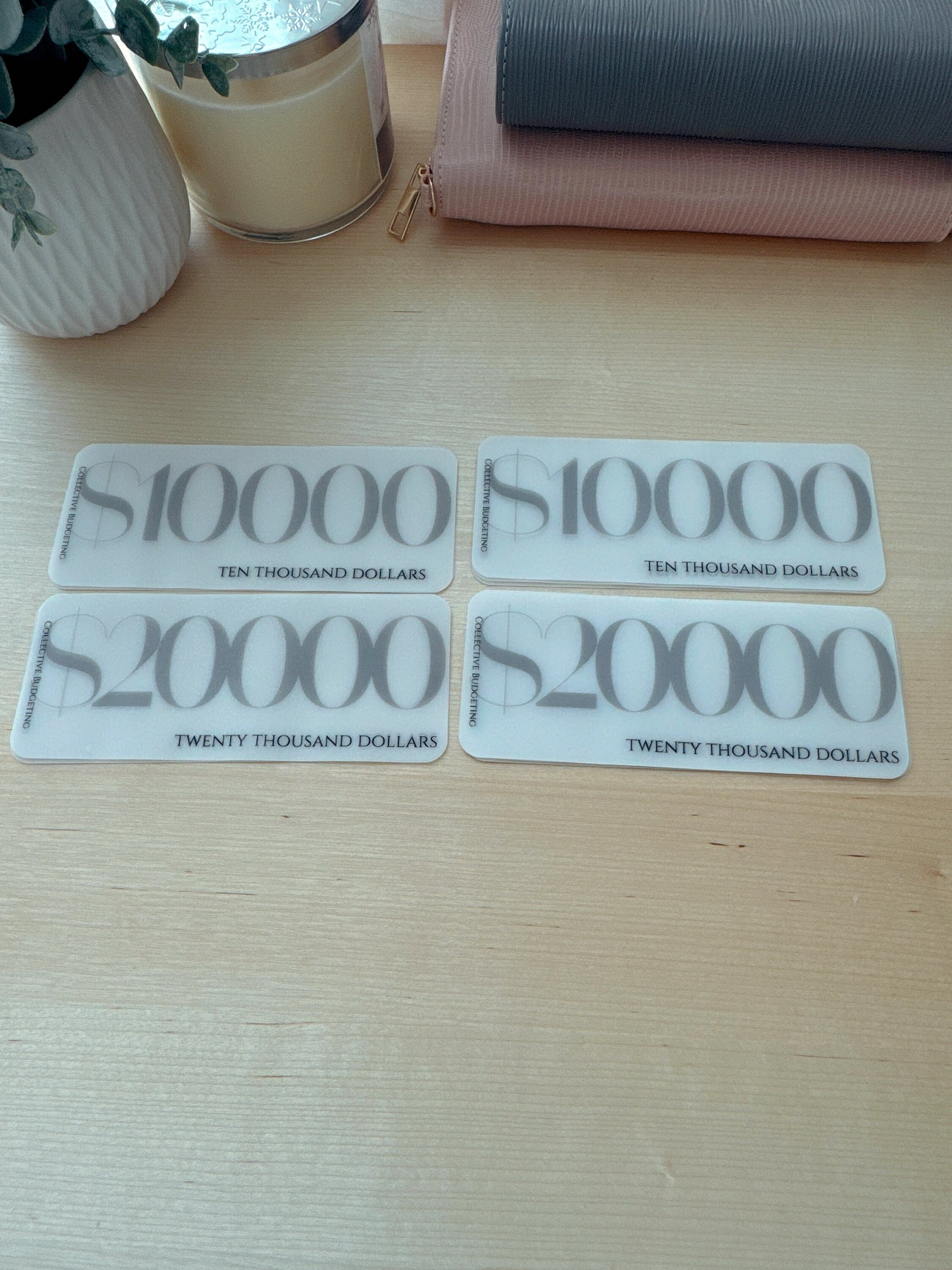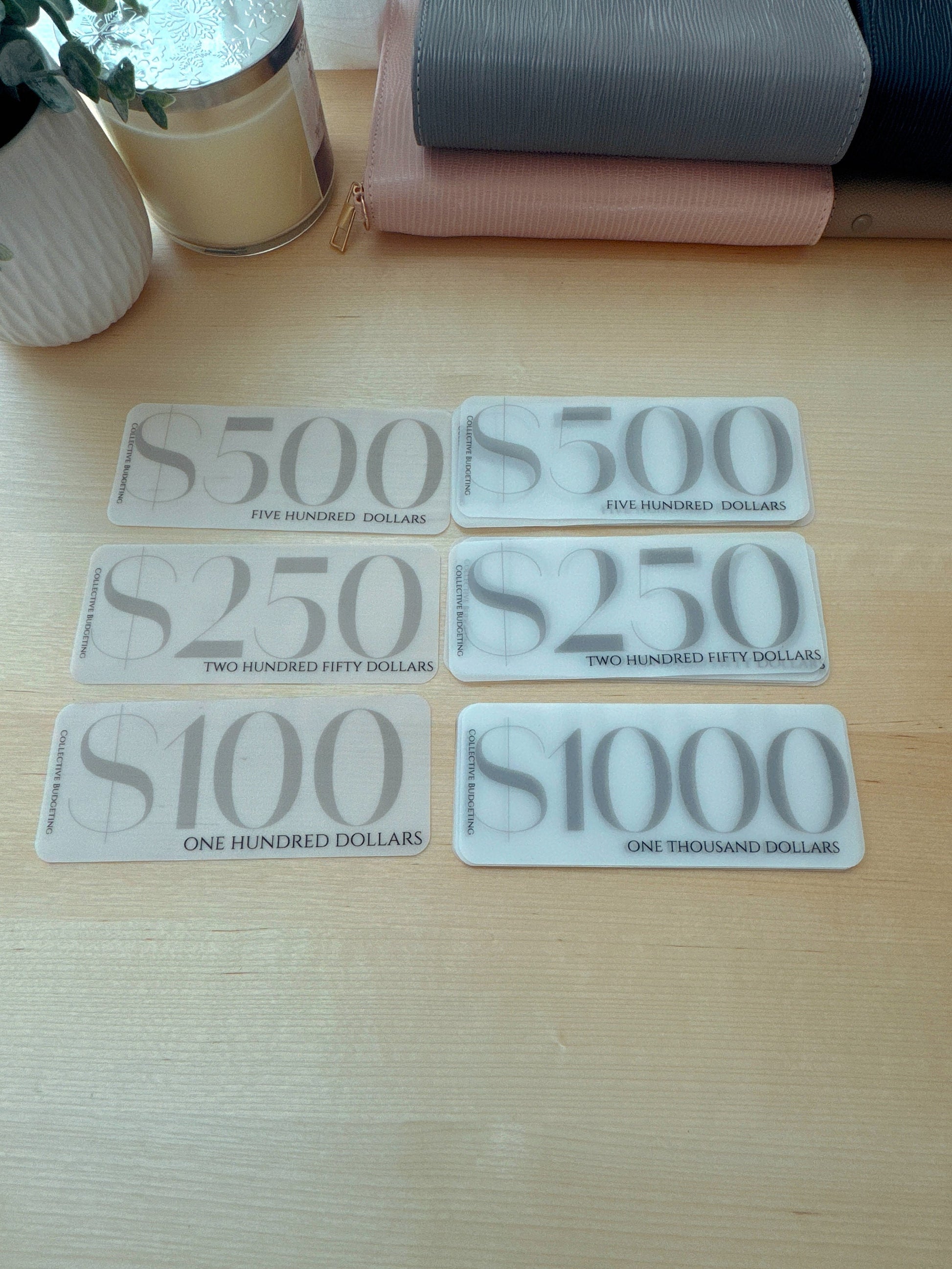 Cash Stuffing Placeholders for Budget Organizers. Handmade Vellum and Laminated Placeholders denominations of $100 through $20,000 and FULLY FUNDED (it depends on which type you like) placeholder Categories for use in Cash Stuffing binders. Dave Ramsey Method.
