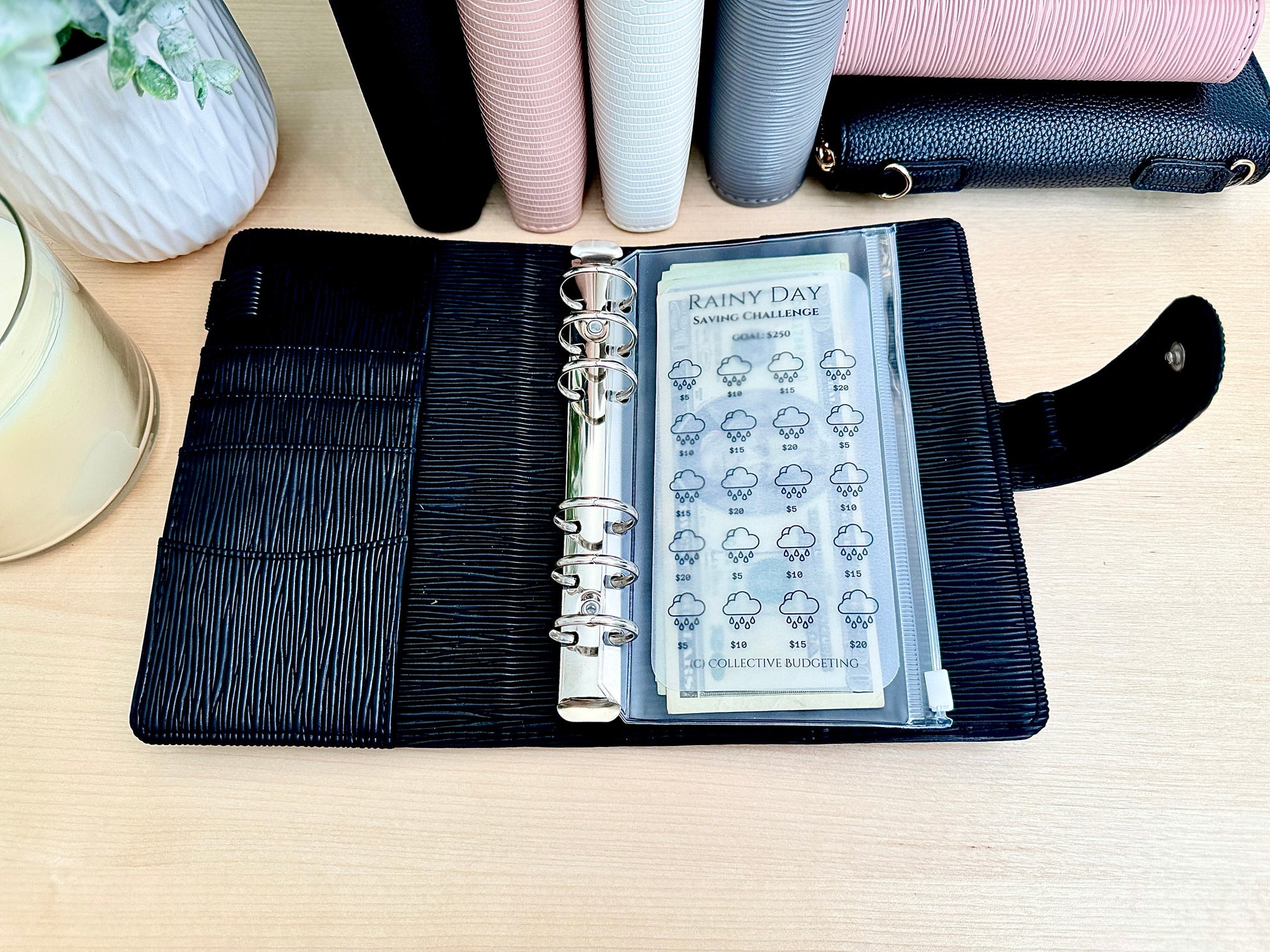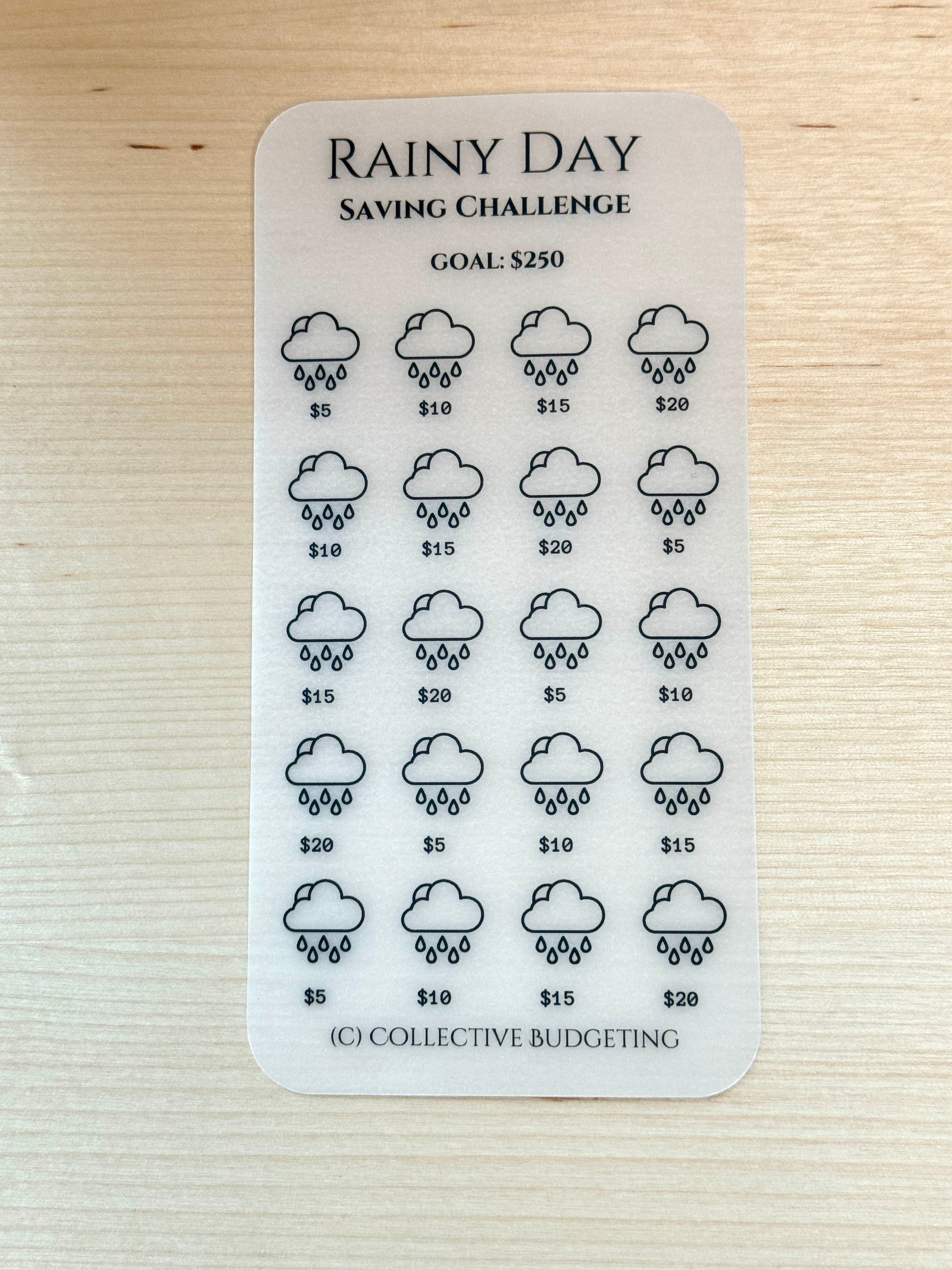 Be ready for anything with this Rainy Day savings challenge card, a matte laminated and reusable tracker printed on premium vellum. Whether it's for car repairs, medical bills, or surprise costs, this card helps you build peace of mind—one dollar at a time.